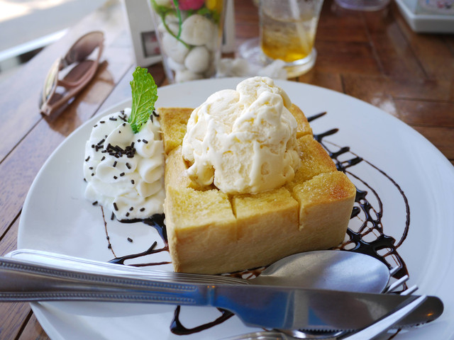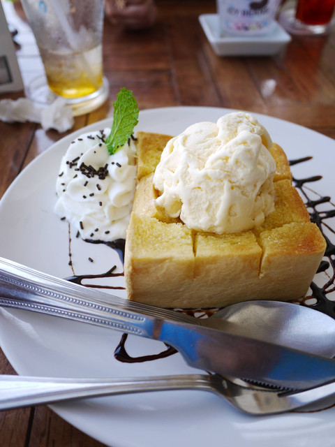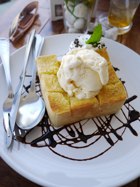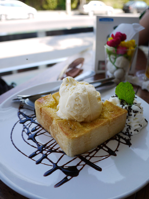 外觀看起來樸實,口味可是不輸人,吐司烤的非常香脆,混著香草冰淇淋一起入口,美味程度已是水準之上!!
